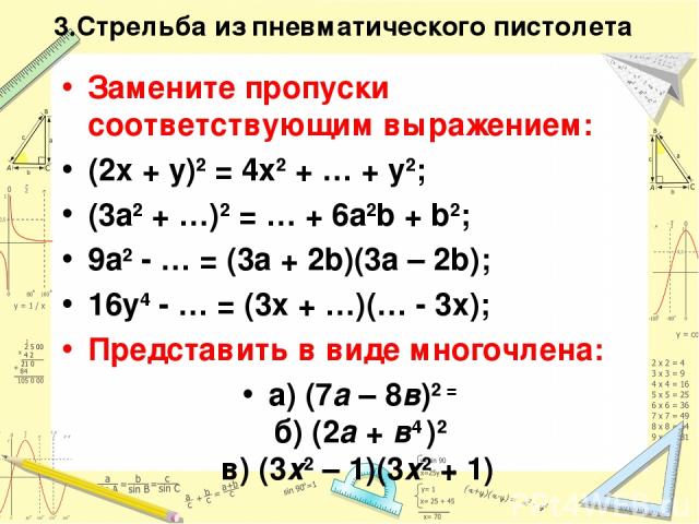 Ученики должны восстановить формулы, заменив звездочки правильными выражениями.