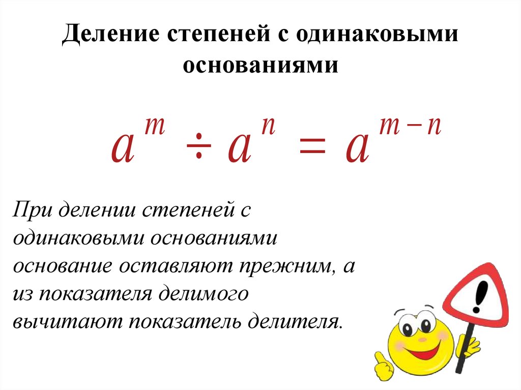 или словами: при делении степеней с одинаковыми основаниями основание степени остается без изменения, а показатель делителя вычитается из показателя делимого (если показатель делимого больше показателя делителя).