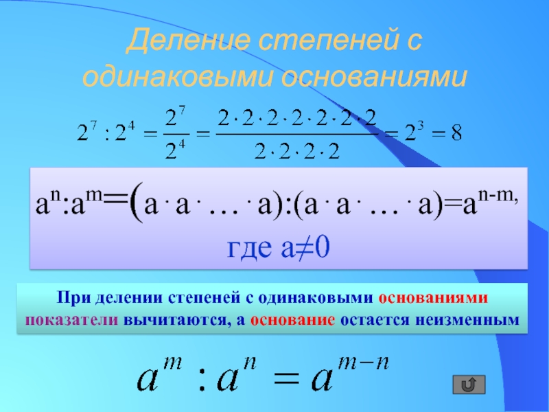 При делении степеней с одинаковыми основаниями из показателя степени делимого вычитают показатель степени делителя.