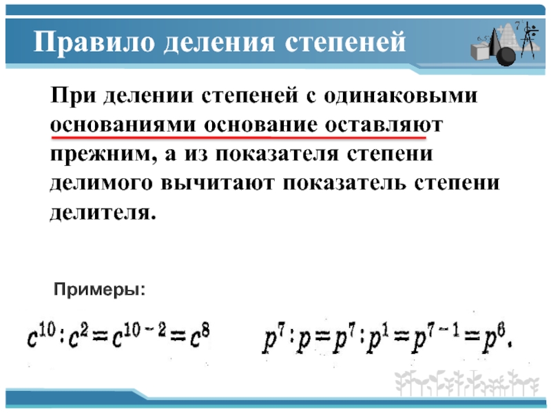 К примеру, am/an = am — n. Основанием степени тут является a, а m и n являются показателями степени в виде натуральных чисел, и при этом m > n.