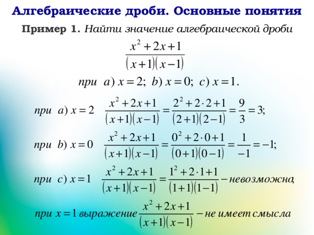 | в) | x 2 − 2 x + 1 x 2 − 1 | = | ( x — 1) 2 ( x + 1)( x — 1) | = | х — 1 х + 1 |