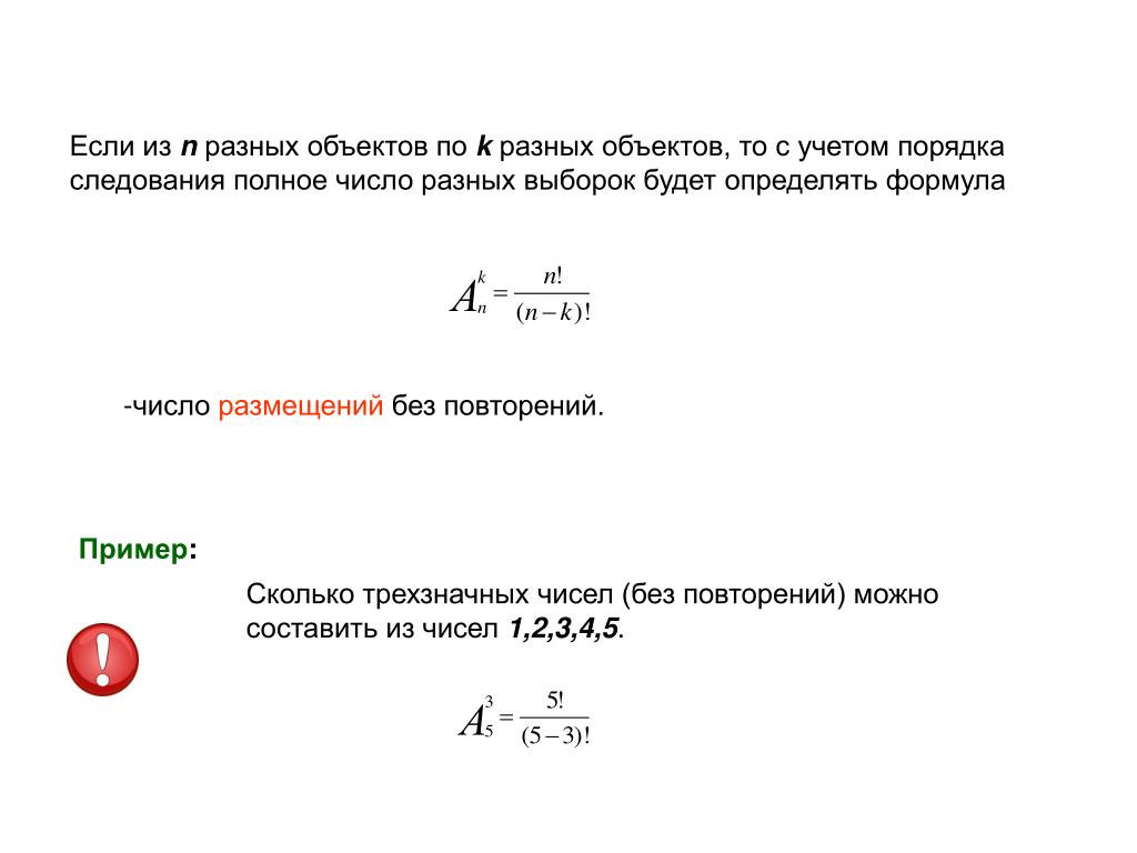 Такая ситуация часто возникает, когда вы работаете с уникальными физическими объектами, которые могут встречаться только один раз в перестановке. Представьте, что у вас есть 10 разных книг, и вы хотите посчитать, сколькими возможными способами вы можете расположить их на книжной полке. После того, как вы поместите первую книгу, вторая книга должна быть другой книгой. Следовательно, это пример перестановок без повторения. Аналитики также называют это перестановками без замены.