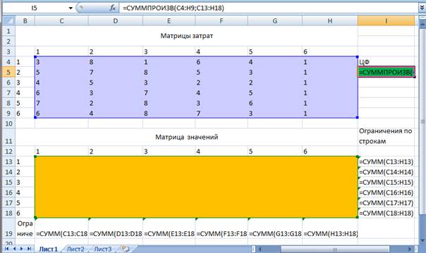 Вводим формулу: =МУМНОЖ(A9:C13;E9:h21). Вводим как формулу массива.