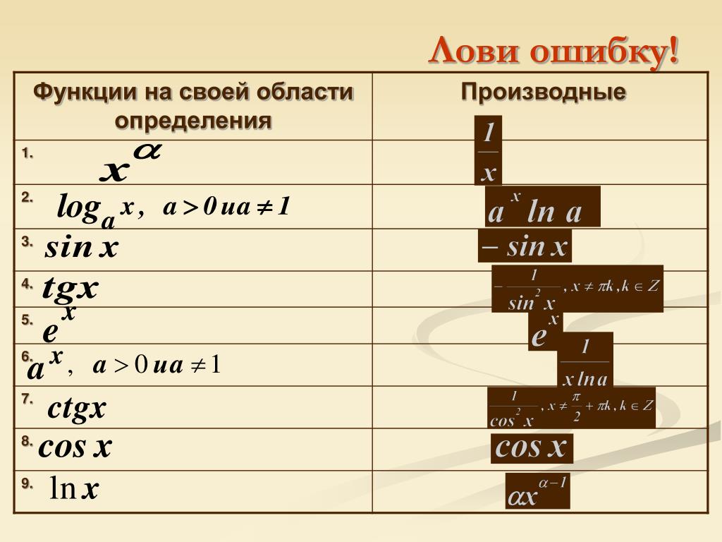 Логарифмическая функция (log a x) » = 1 x · ln a В частности, при a = e имеем y = ln x (ln x) » = 1 x | Тригонометрические функции (sin x) » = cos x (cos x) » = — sin x (t g x) » = 1 cos 2 x (c t g x) » = — 1 sin 2 x |