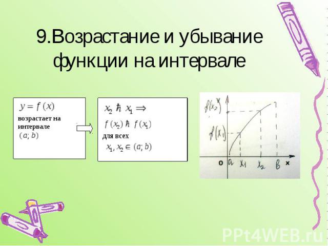если производная функции y = f(x) положительна для любого x из интервала X, то функция возрастает на X;