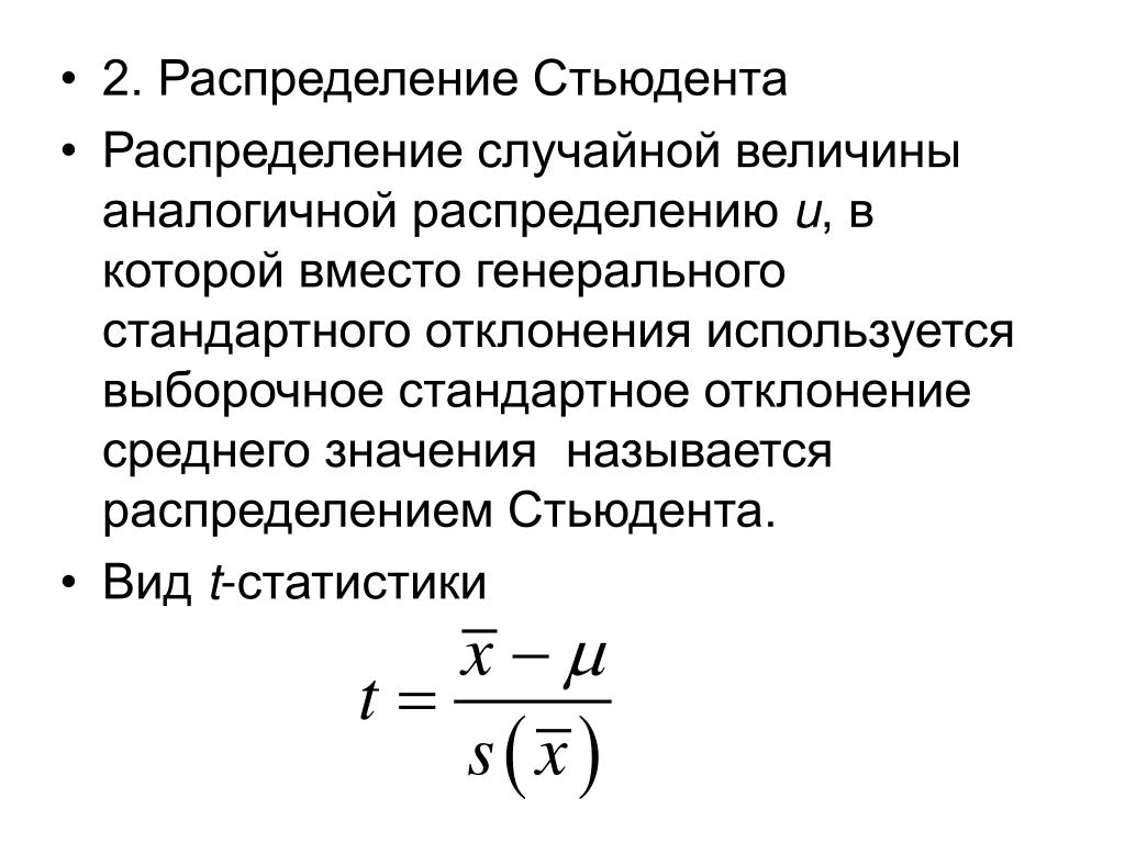 Обычно распределение Стьюдента появляется в задачах, связанных с оценкой математического ожидания нормально распределенных случайных величин. Пусть X1 , …, Xn – независимые случайные величины, нормально распределенные с математическим ожиданием μ и дисперсией σ 2. Тогда мы можем получить следующие оценки для параметров μ и σ 2: