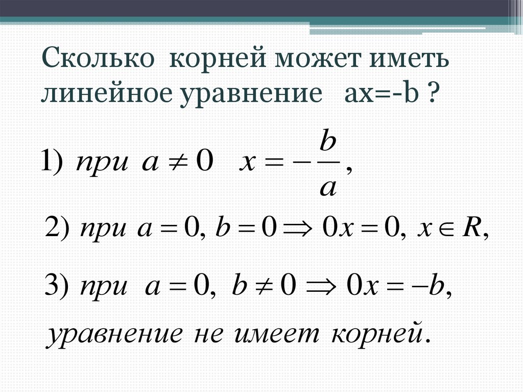 Линейное уравнение – уравнение вида ax+b=0, где x – переменная, a и b некоторые числа, причем a≠0.
