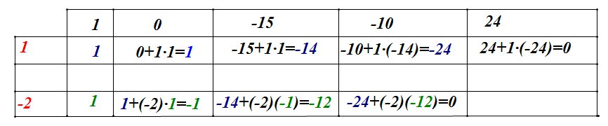 В верхней строке выставляются коэффициенты исходного многочлена, при этом первая ячейка верхней строки остается пустой.