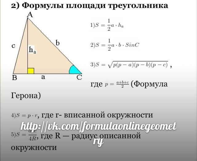 Зная как найти недостающую сторону, имея две стороны и угол между ними можно легко посчитать площадь. Формула площади треугольника через косинус помогает легко и быстро найти решение различных задач.