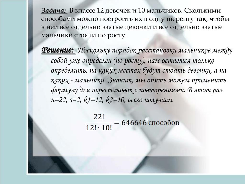 Еще один способ решить проблему с чередованием мальчиков и девочек — это метод n выбрать k (n,k).