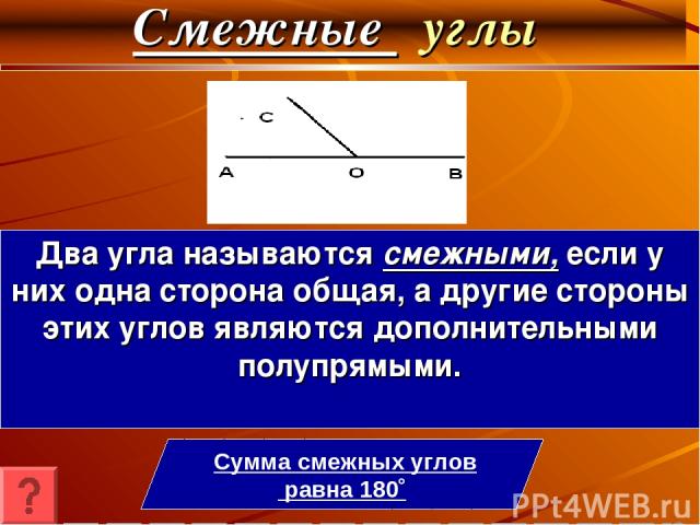 Смежные углы — два угла с общей вершиной, одна из сторон которых — общая, а оставшиеся стороны лежат на одной прямой (не совпадая). Сумма смежных углов равна 180°.