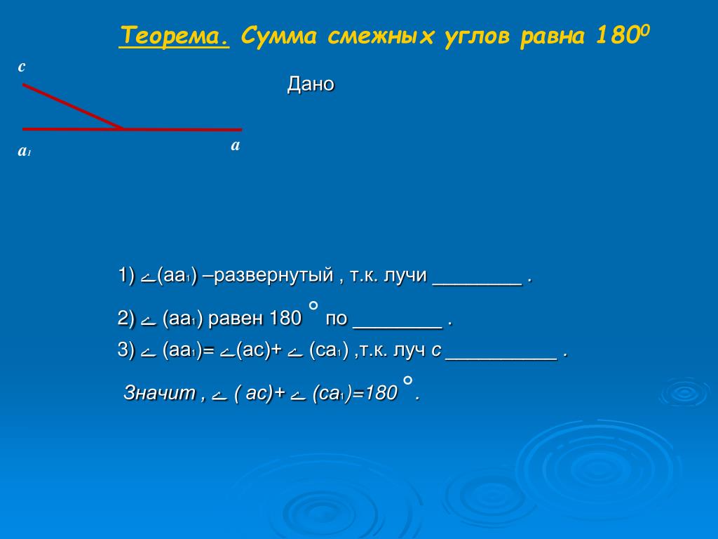 Теорема 1. Сумма смежных углов равна 180 градусов.