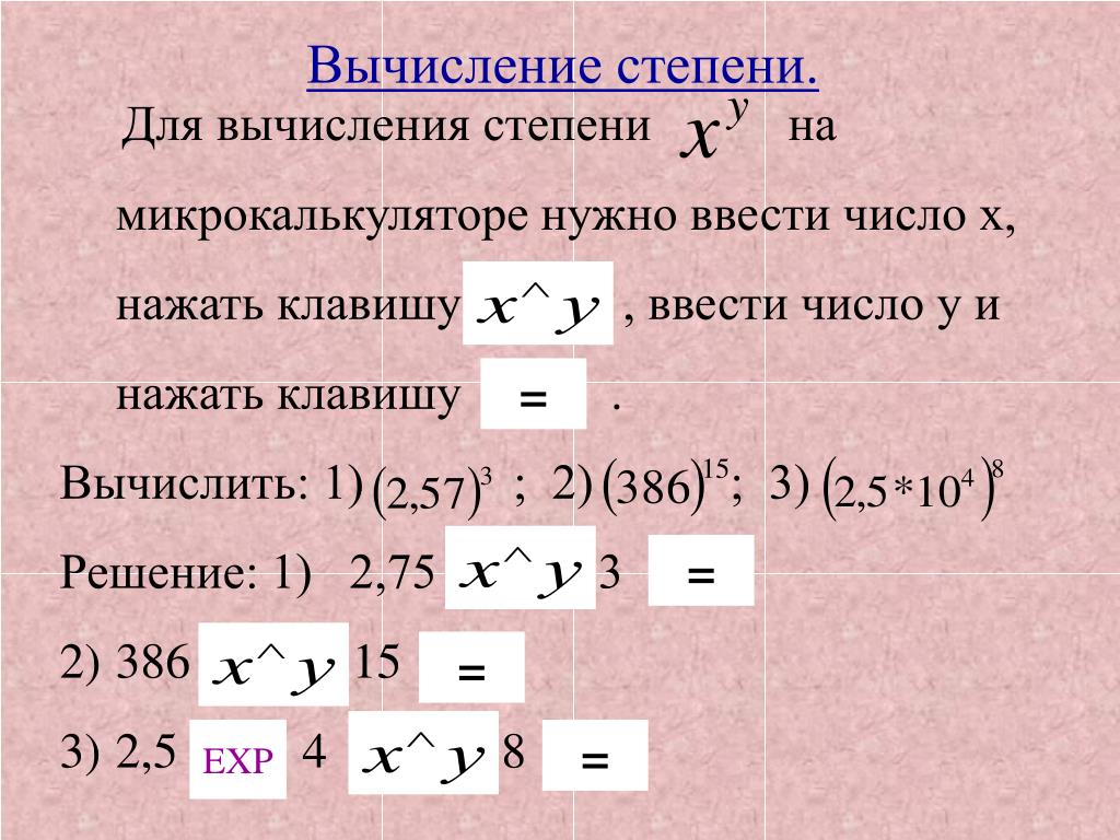 Таким образом, вычисление дробной степени нужно выполнять в два действия: возведение в целую степень и нахождение корня n -ной степени.