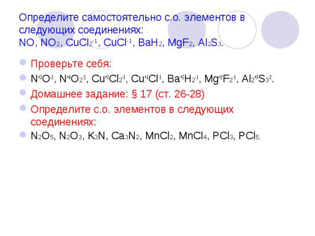 Степени окисления CCl4, h3O, PbO, h3S, S, CuCl2, Cr2(SO4).