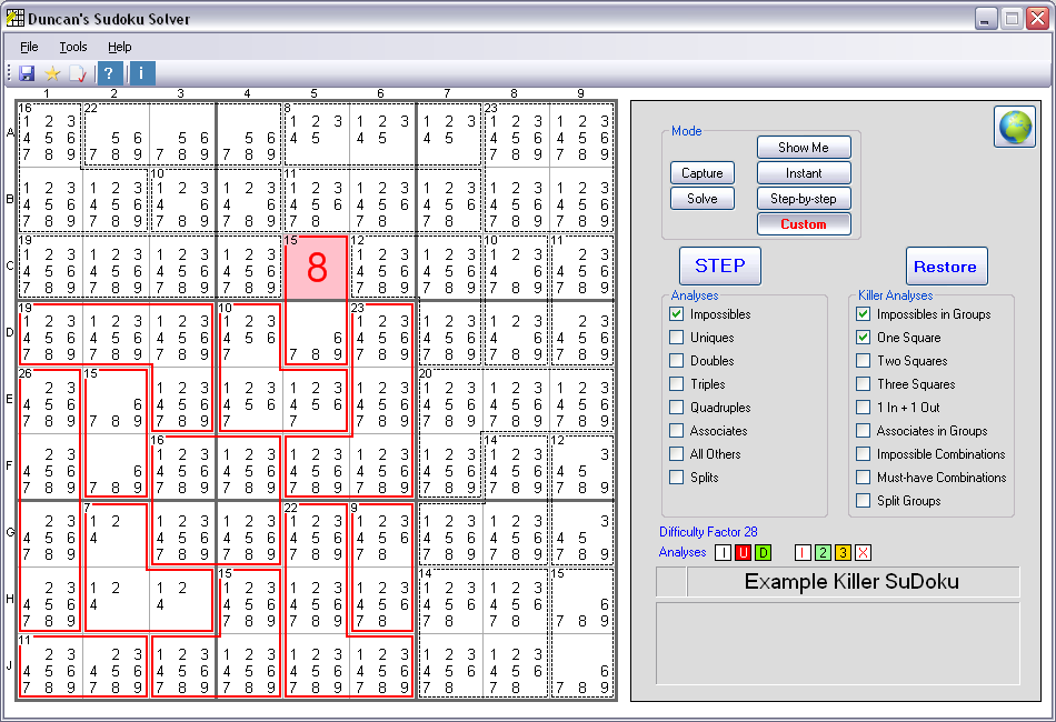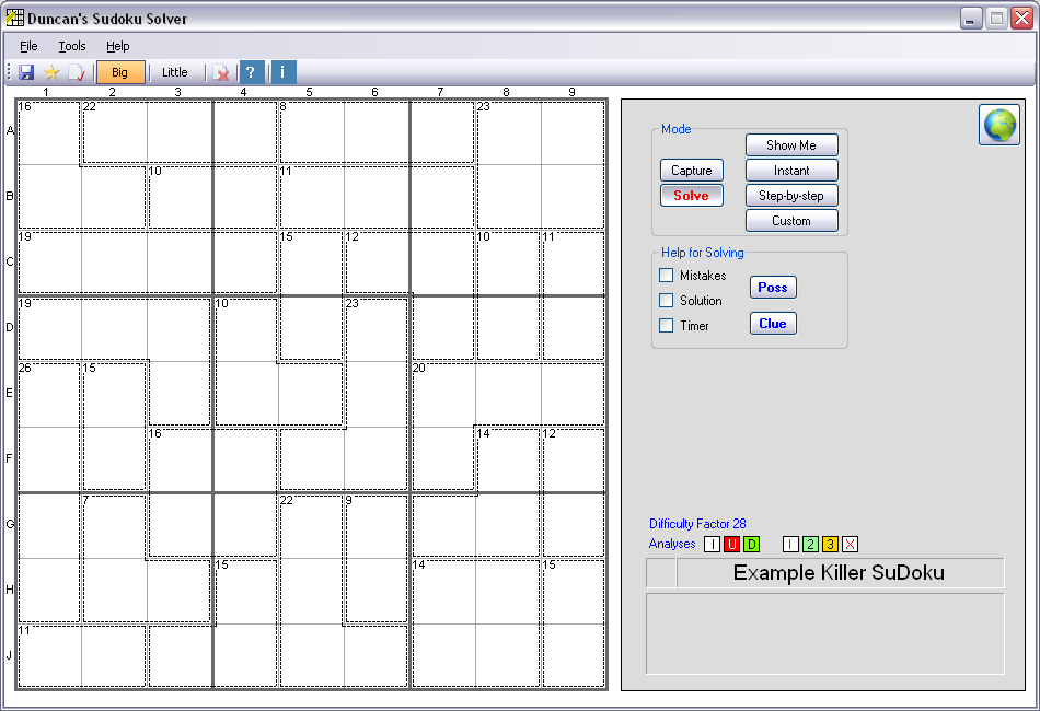 Основной процесс, который я использую для решения головоломок, очень прост; это не что иное, как алгоритм рекурсивного поиска с возвратом методом грубой силы. Как и в большинстве программ, написание кода для пользовательского интерфейса, ввода и вывода данных и проверки ошибок заняло в два раза больше времени, чем код для вычисления решения!