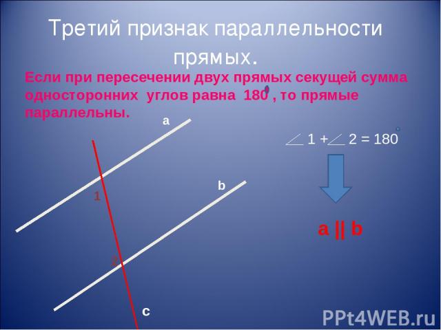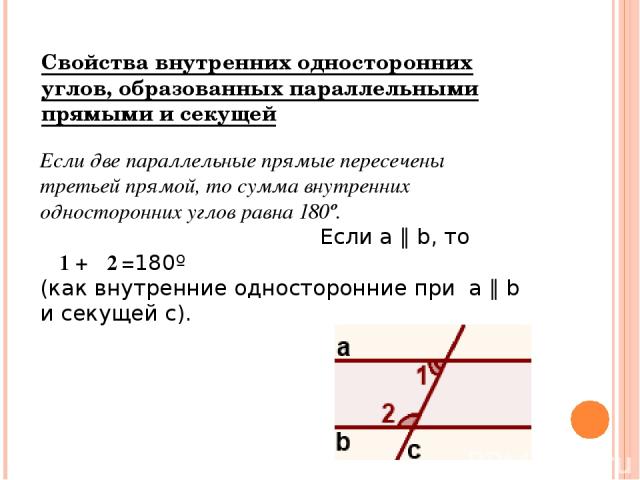 Признак параллельности прямых по сумме градусных мер односторонних углов