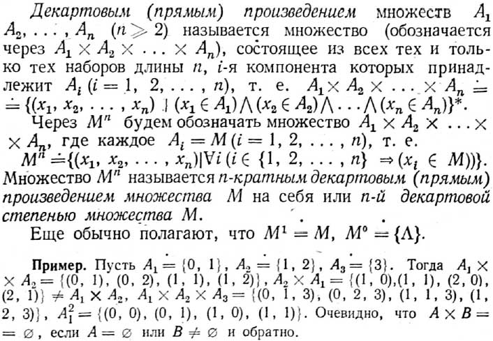 - Пусть A и B — два непустых множества. Множество всех упорядоченных пар (a, b), таких что a A и b B, называется декартовым произведением множеств A и B и обозначается A x B. Таким образом, A x B = {(a, b): a ∈ A и b ∈ B }