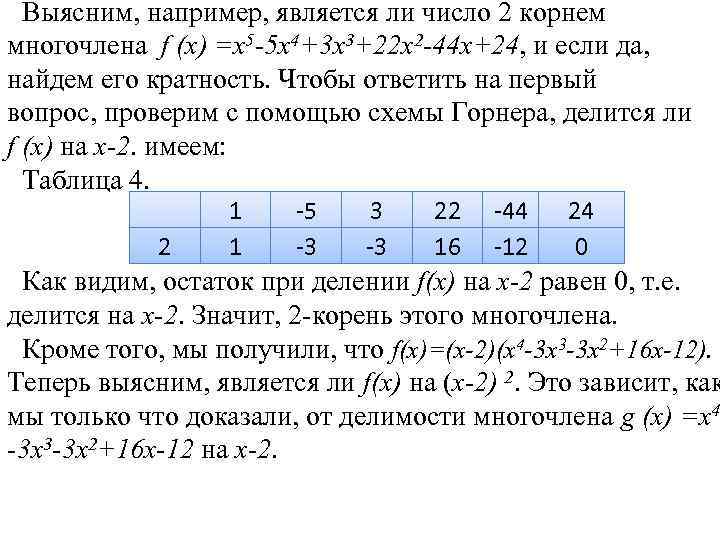 Наконец, об уравнениях высоких степеней. Иногда однократное деление не приводит к окончанию решения, потому что корней несколько и многочлен можно продолжать делить. В этом случае, выполнив деление и получив новый многочлен степенью ниже, снова пытаются найти целые корни среди делителей его свободного члена. При этом подстановка предполагаемых корней в многочлен может занимать даже больше времени, чем заполнение таблицы по Горнеру. Тогда таблицу продолжают вниз, дополняя ее просто новыми строками, а в случае появления остатка (деление не выполнено) эту строчку зачеркивают и пробуют новый корень в следующей строке. Пример:
