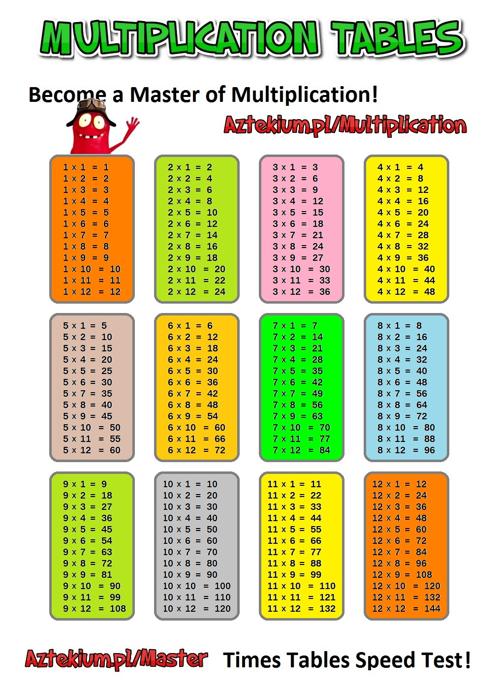 PDF-файл для печати, в котором перечислены все таблицы умножения от 1x до 10x. Яркое, красочное и бесплатное скачивание. Что не любить?!Сегодняшняя математика? Распечатанная таблица умножения!