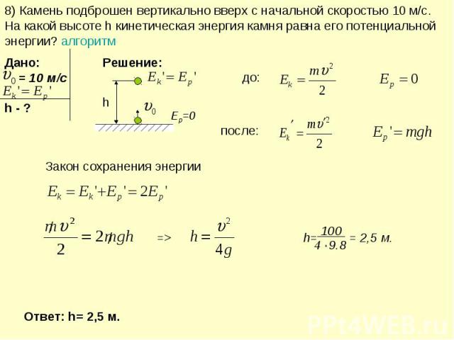 Задача 14514 Камень массой m = 1 кг брошен вертикально вверх с начальной скоростью v0 = 9,8 м/с. Построить график зависимости от расстояния h кинетической Wк, потенциальной Wп и полной W энергий камня.