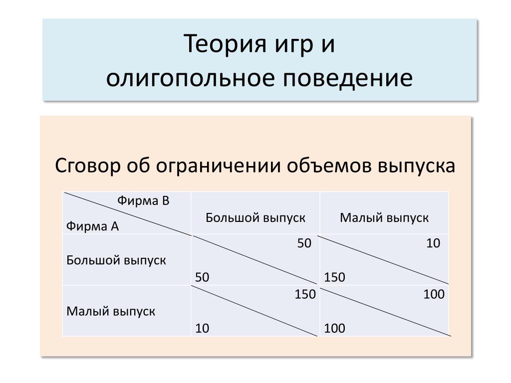 - Однако, если во время сговора фирма А сбивает сговорившуюся цену и устанавливает низкую цену – она способна продать больше. В этом случае фирма А извлекает выгоду из лучшего из обоих миров. Цены высоки, потому что фирма B устанавливает высокую цену, но фирма A также продает большие объемы, потому что она уступает конкуренту. В этом случае фирма А зарабатывает 10 млн фунтов стерлингов, а фирма В — только 2 млн фунтов стерлингов.