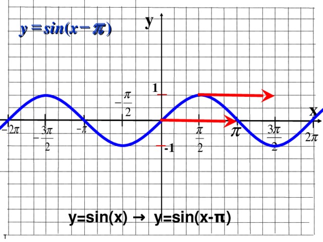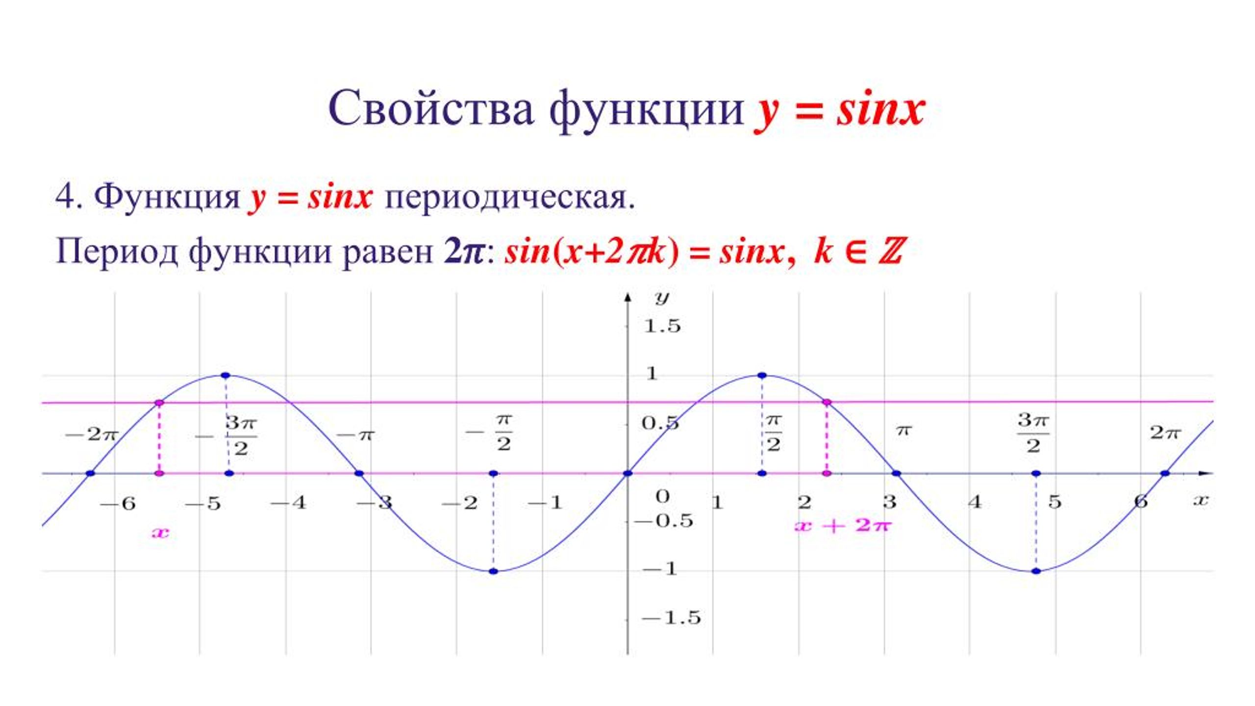 Функция y=sin x — периодическая с периодом T=2π. Поэтому график функции, взятый на на промежутке [-π;π], повторяется бесконечное число раз вправо и влево.