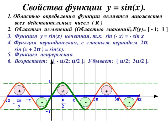 | sin 0 = 0 | sin или /2 = 1 | sin или = 0 | sin 3 o /2 = -1 |