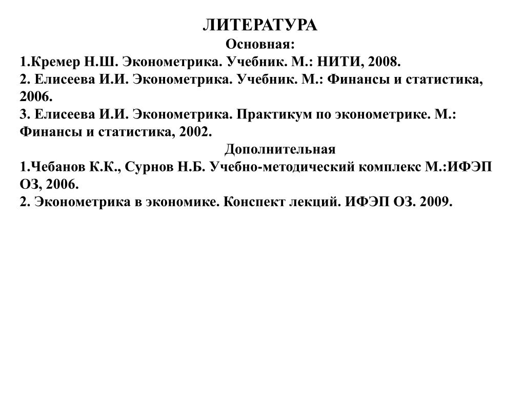 Эконометрика. Учебник. Под ред. И.И. Елисеевой. М., «Финансы и статистика». 2003. — 346с.