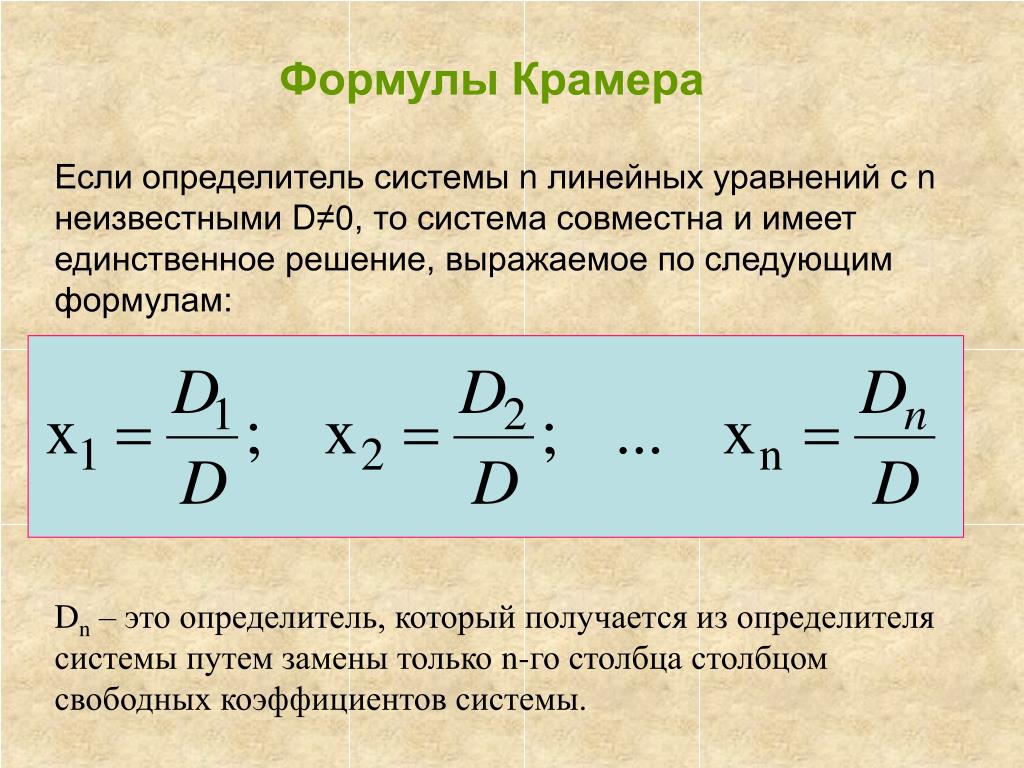 Теорема Крамера Если главный определитель $D$ основной матрицы, составленной на основе коэффициентов уравнений, не равен нулю, то система уравнений совместна, причём решение у неё существует единственное. Решение такой системы вычисляется через так называемые формулы Крамера для решения систем линейных уравнений: $x_i = \frac{D_i}{D}$