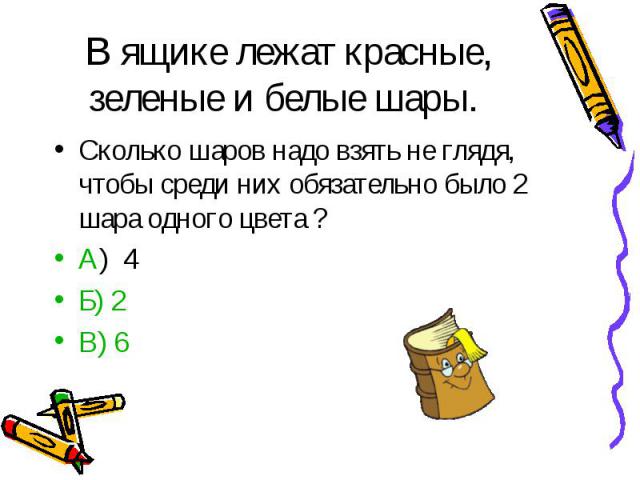 | 2 | В банке 6 красных, 3 зеленых, 5 белых и 7 желтых шаров. Из банки выбираются два шара с заменой. Какова вероятность того, что оба шара зеленые? Ничего из вышеперечисленного. | · = = Ответ: |