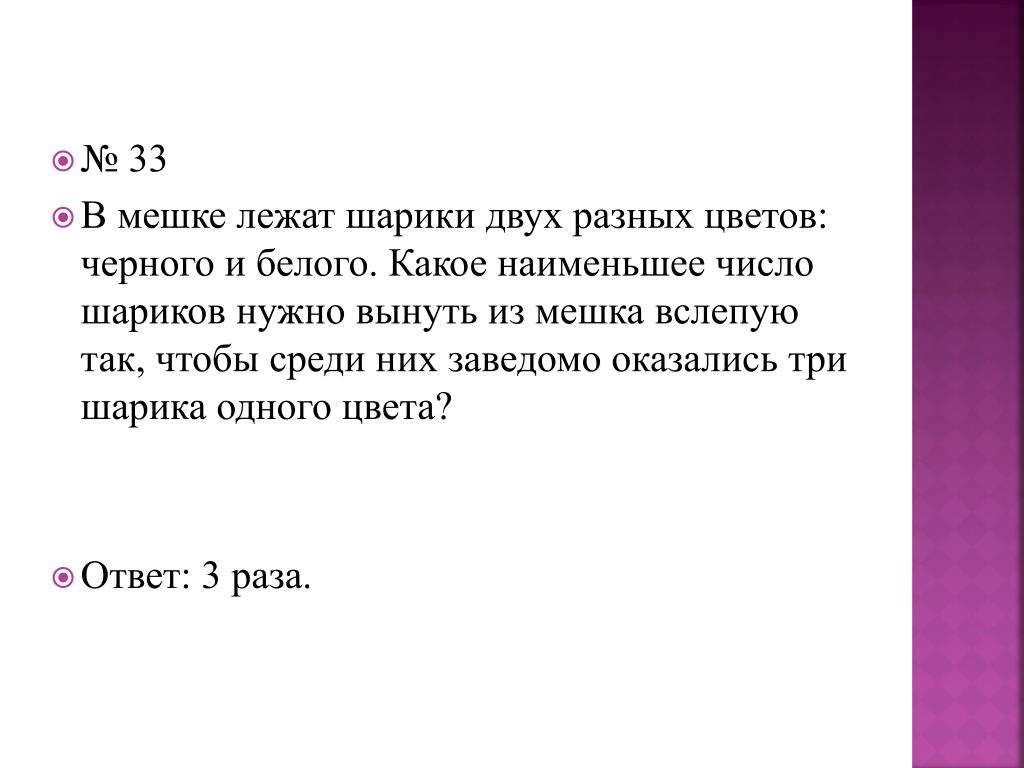 | 7 | В банке 5 красных, 3 зеленых, 2 фиолетовых и 4 желтых шарика. Из банки случайным образом выбирается шарик. После его замены выбирается второй шарик. Какова вероятность того, что вы выберете сначала фиолетовый, а затем красный шарик? | P(фиолетовый, красный) = P(фиолетовый) · P(красный) = · = = Ответ: |