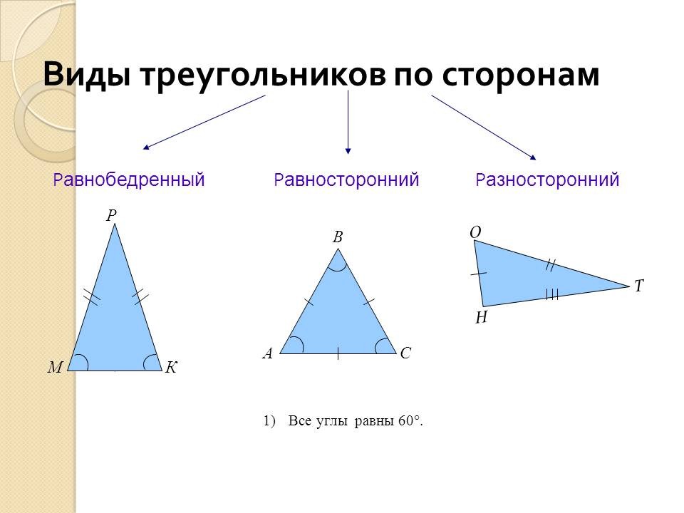 По сторонам различают 3 вида треугольников: разносторонние, равнобедренные и равносторонние.