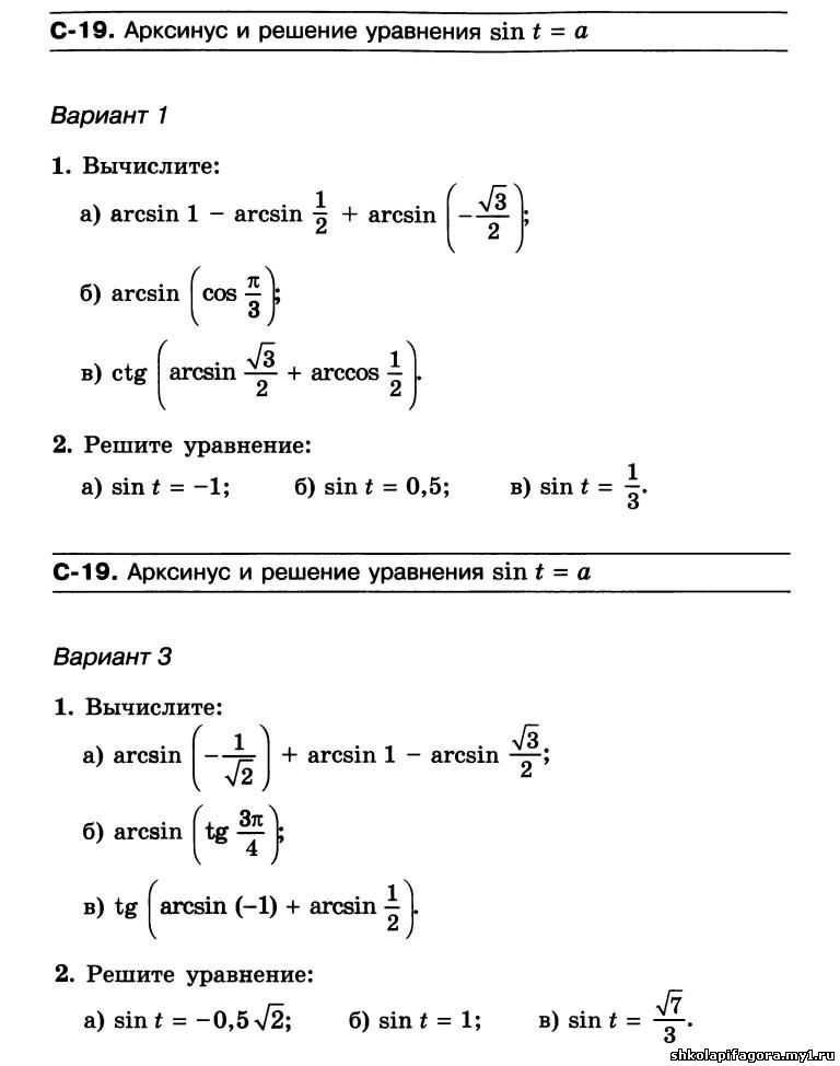 | arcsin(`1`) | 7 909 4 18 90018 900 | `pi/3`Синтаксис: arcsin(x), где x — число. Иногда используются другие обозначения: asin Примеры:arcsin(`0`) возвращает 0 Производная арксинуса :Чтобы дифференцировать функцию арксинуса онлайн, можно использовать калькулятор производной, который позволяет вычислить производную функции арксинуса 92)` Предел арксинуса :Калькулятор предела позволяет вычислить пределы функции арксинуса. предел арксинуса (x) is limit(`»arcsin»(x)`) Обратная функция арксинуса :обратная функция арксинуса представляет собой синусоидальную функцию, отмеченную как sin. Графический арксинус :Графический калькулятор может отображать функцию арксинуса в заданном интервале. Свойство функции арксинуса: Функция арксинуса является нечетной функцией. Расчет онлайн с арксинусом (арксинусом) См. также Список связанных калькуляторов: Напоминания о курсах, калькуляторы, упражнения и игры: Тригонометрические функции, Вещественные функции