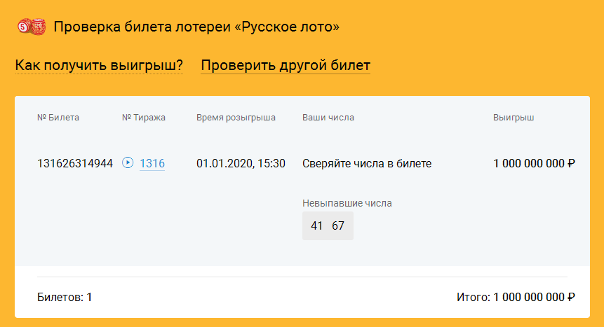 Невыпавшие числа. Если ни одного из этих чисел на игровом поле вашего билета нет, то ваш билет выиграл!