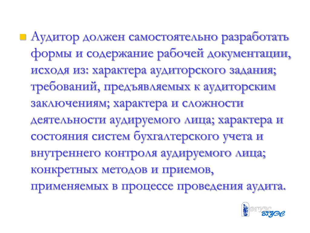 Аудитор координирует и проводит финансовый, операционный и нормативный аудит в соответствии с установленными ведомственными и профессиональными стандартами аудита. Определяет существенность выводов. Готовит рабочие документы, подтверждающие мнения, представленные в отчетах.