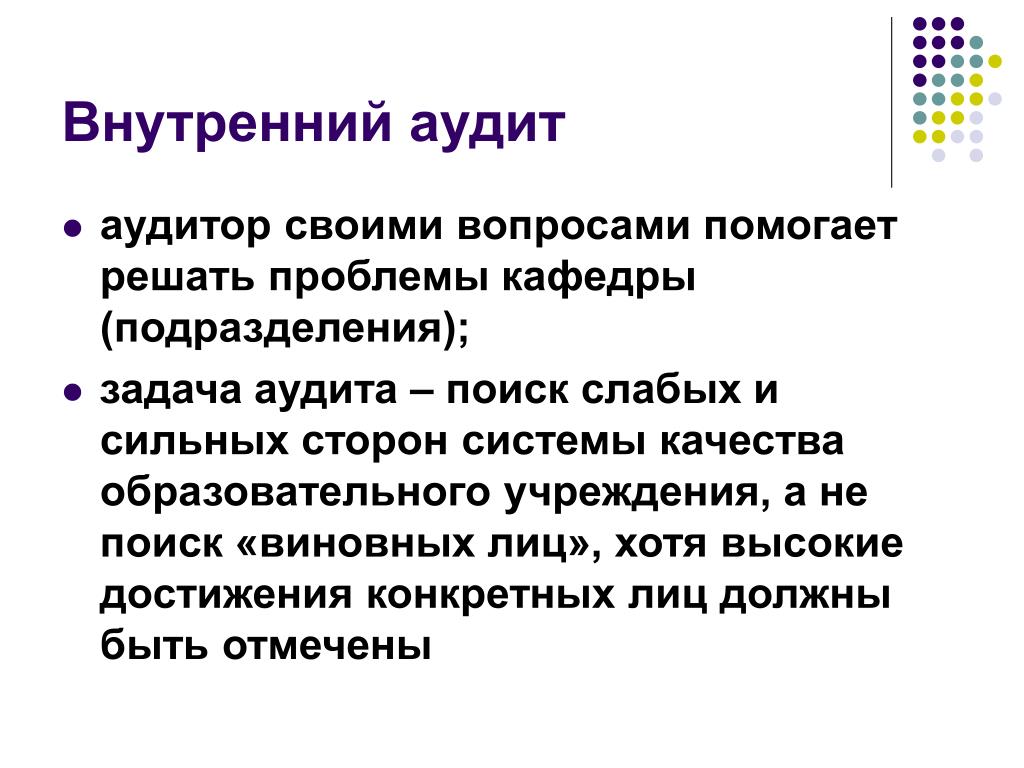- Инициатива по выявлению возможностей и выработке рекомендаций по улучшению политики, практики и процессов, связанных с функциями аудита.