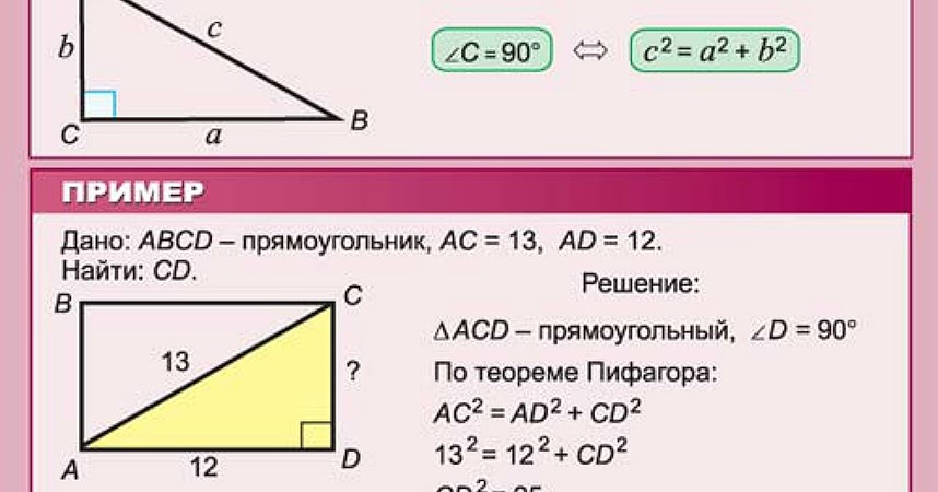 Теорема Пифагора позволяет найти длину любой из трех сторон прямоугольного треугольника. Это одна из тех вещей, которые вы должны запомнить, поскольку она встречается во всех областях математики и, следовательно, во многих различных математических курсах, которые вы, вероятно, будете изучать. Помните, чтобы избежать распространенной ошибки, когда вы путаете катеты в формуле с гипотенузой, и всегда рисуйте рисунок, если его нет.