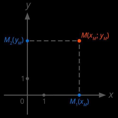 Любой точке M координатной плоскости сопоставляются два числа (две координаты): . Для получения этих координат необходимо через точку M провести две прямые, параллельные координатным осям. Одна прямая пересечёт ось абсцисс (ось X) в точке с координатами , вторая прямая пересечёт ось ординат (ось Y) в точке с координатами (см. Рис. 2).