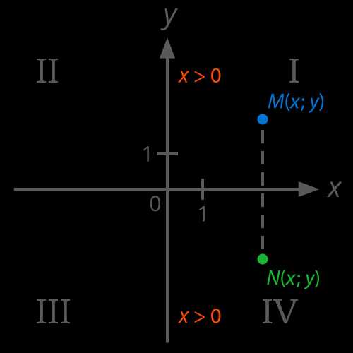 Построим координатную плоскость. Так как абсцисса точки больше нуля, а знак ординаты не задан, то такая точка может лежать в первом (точка M) или четвёртом (точка N) координатном углу (см. Рис. 5в).
