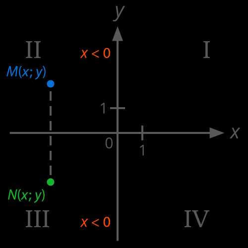 Построим координатную плоскость. Так как абсцисса точки меньше нуля, а знак ординаты не задан, то такая точка может лежать во втором (точка M) или третьем (точка N) координатном углу (см. Рис. 5г).