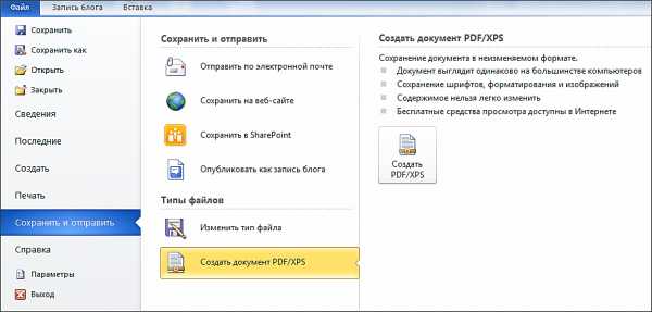 После установки данного дополнения в меню «Файл – Сохранить и оправить» появляется новый пункт меню «Создать документ PDF/XPS». Открыв это меню, вы увидите кнопку «Создать PDF/XPS».