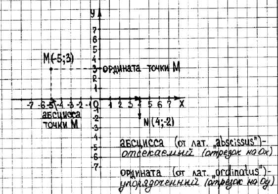 ΠΠΎΠΎΡΠ΄ΠΈΠ½Π°ΡΡ ΡΠΎΡΠΊΠΈΒ Π — ΠΏΠ°ΡΠ° ΡΠΈΡΠ΅Π»Β (x, y). ΠΠ΅ΡΠ²ΠΎΠ΅ ΡΠΈΡΠ»ΠΎΒ xΒ — ΠΊΠΎΠΎΡΠ΄ΠΈΠ½Π°ΡΠ° ΠΎΡΠ½ΠΎΠ²Π°Π½ΠΈΡ ΠΏΠ΅ΡΠΏΠ΅Π½Π΄ΠΈΠΊΡΠ»ΡΡΠ°, ΠΎΠΏΡΡΠ΅Π½Π½ΠΎΠ³ΠΎ ΠΈΠ· ΡΠΎΡΠΊΠΈΒ MΒ Π½Π° ΠΎΡΡΒ OX; Π²ΡΠΎΡΠΎΠ΅ ΡΠΈΡΠ»ΠΎΒ yΒ — Π½Π° ΠΎΡΡΒ OY.Β