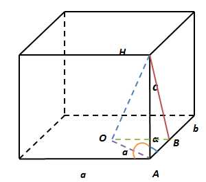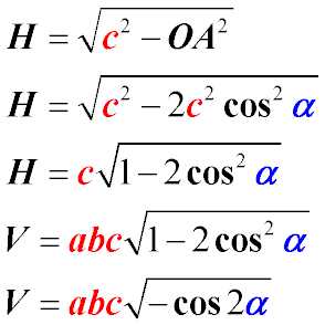 Так как углы, образуемые ребром с с ребрами а и b, равны, то треугольник АОВ равнобедренный и прямоугольный, катеты которого АВ=ОВ=с*cosα, а гипотенуза ОА= *c*cosα |