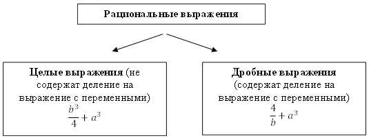 Рациональные выражения делятся на целые и дробные выражения.