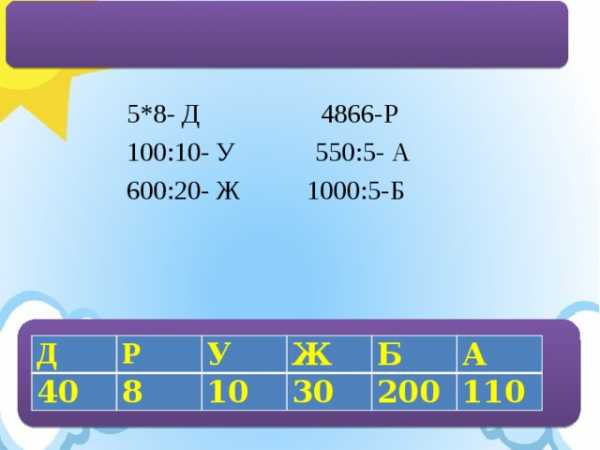 К доске выходят от каждой команды по порядку ученики, которые решают примеры, записанные столбиком на доске, выбирают на столе карточку с ответом, относят ответ команде, они приносят букву, соответствующую ответу на стол учителя. И мы узнаем, какие планеты есть в Солнечной системе. (Слайд 14)