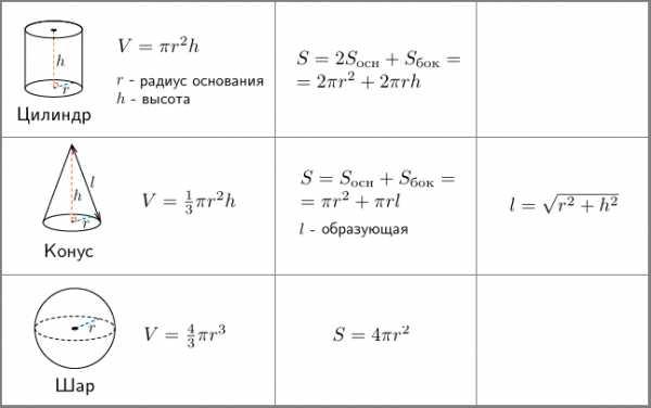 Формулы объема, площади поверхности, объем конуса, объем цилиндра, объем шара