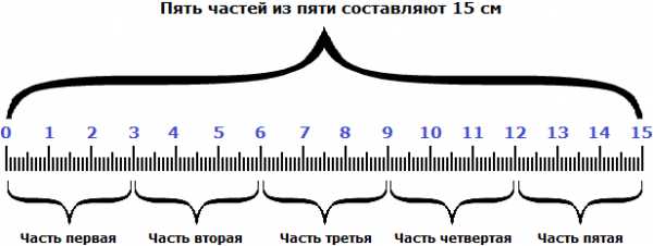 Чтобы узнать длину всей линейки, сначала нужно узнать длину одной части. Как это узнать? Попробуем догадаться, внимательно изучив следующий рисунок: