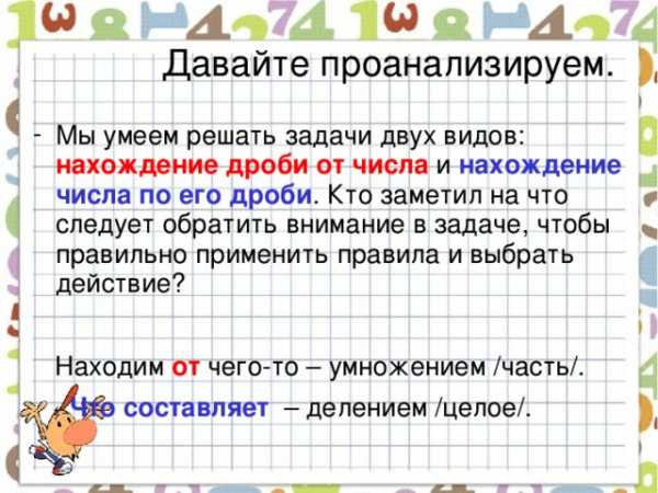Почему же после деления числа на знаменатель дроби приходиться умножать полученный результат на числитель дроби? Дело в том, что знаменатель дроби показывает на сколько частей что-либо разделено, а числитель показывает сколько частей было взято.